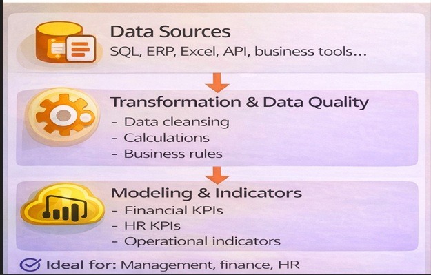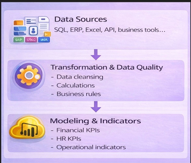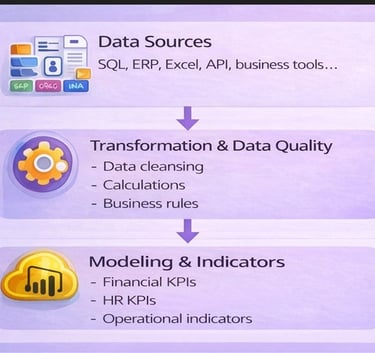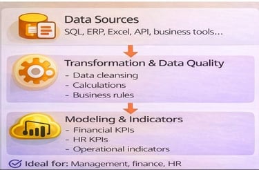 Our role is to connect to your existing sources, secure and structure the information, and transform it into clear, reliable and immediately actionable Power BI indicators.