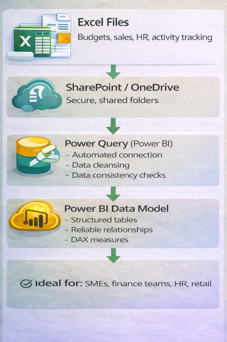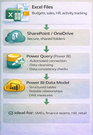 We centralize files in a secure SharePoint or OneDrive environment, automate data integration, and ensure consistency and reliability.