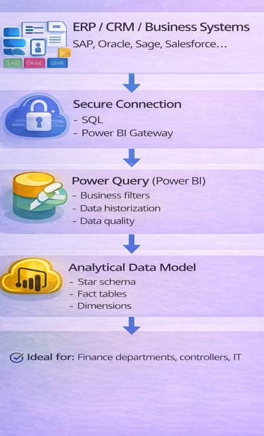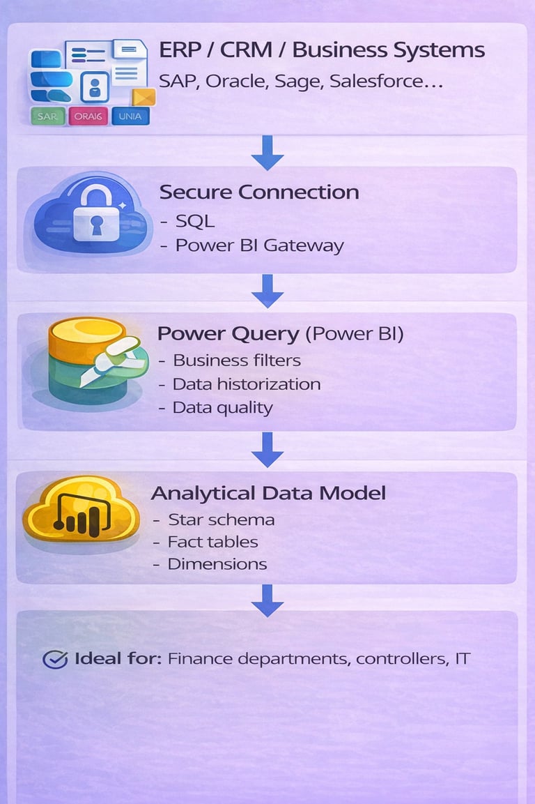 We implement secure connections (SQL, APIs, Power BI Gateway) and structure data into a robust analytical model.